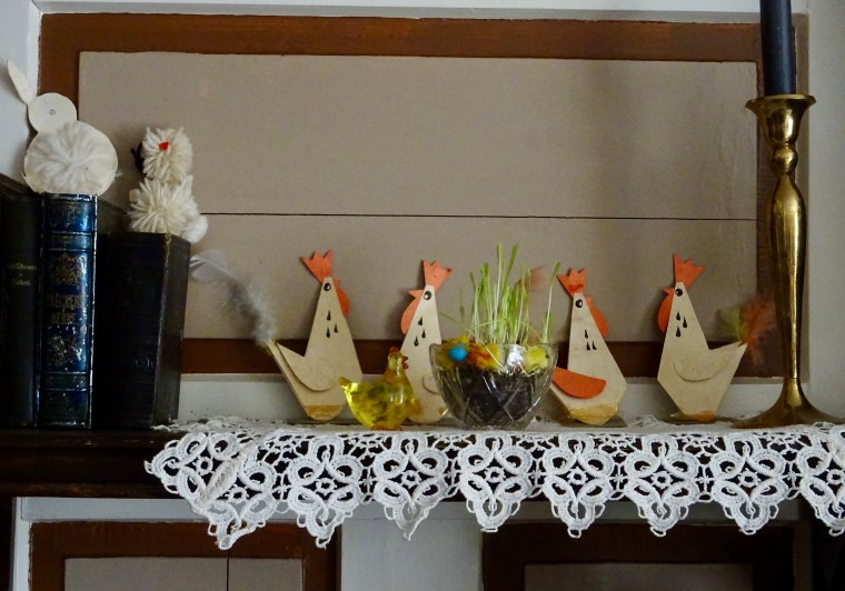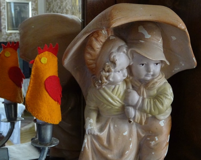 Talon rakentaja Helmi Kallio oli ompelijayrittäjä. Luonnollisesti siis Helmilä, kuten hän itse rakennuttamaansa taloaan kutsui, puettiin vuodenaikojen mukaan. Jatkan äitini tavoin tätä tapaa. Joka vuosi jaksan ihmetellä, kuinka pelkästään verhojen vaihtaminen muuttaa kamarin ilmeen. Talvisin Helmin tekemät villaiset tyynyt ja sinapinkeltaiset samettiverhot luovat lämmintä tunnelmaa. Verhot eristävät myös talven tuulien tuntua. Kesällä vaihdan samettisten tilalle äitini ompelemat kevyet verhot, jotka päästävät luonnonvalon sisään. Sohva saa ylleen kevyen puuvillapeiton ja pitsityynyt.